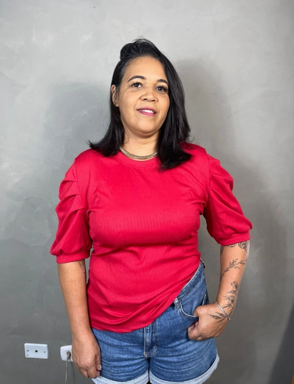 Detalhes: Gola redonda, mangas com leve franzido e caimento soltinho